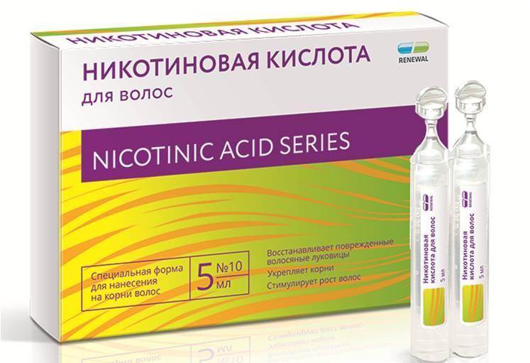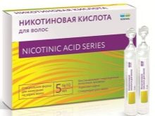 - Nicotinic acid (B3). Form - ampoules. Method of application - rubbing into the scalp. The drug helps to improve blood circulation and enhances hair growth.