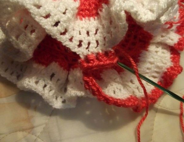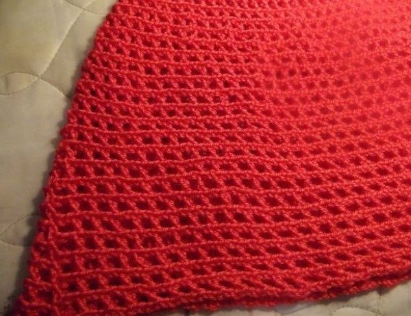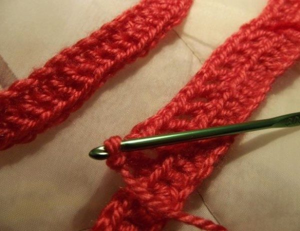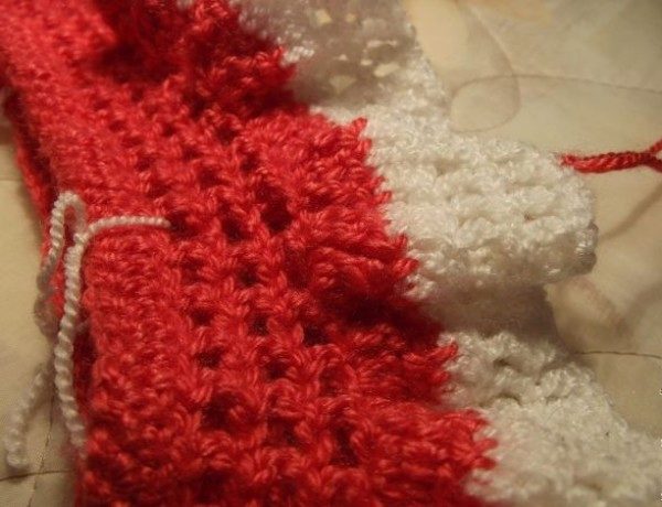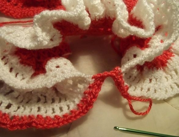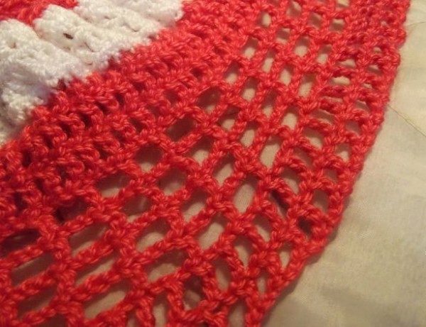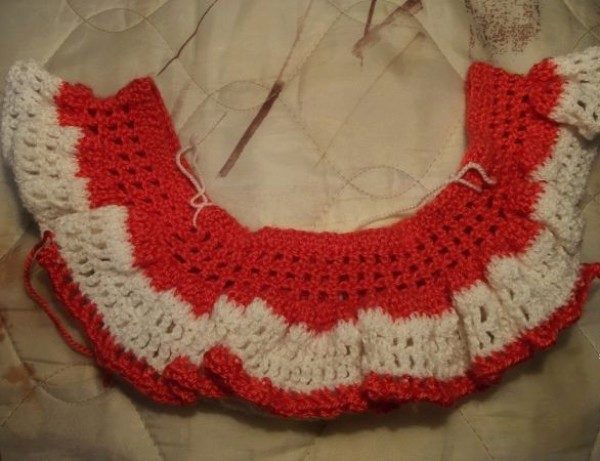 - In the 9th row, change the thread to red again. Fold the yoke of the dress in half and mark the line of the armhole. Begin the decrease by associating: * a column with a 1st nap, vozd. loop, through the three loops column with 1st crochet and vozd. a loop*. Repeating rapport, we form in front and back, without breaking the thread.