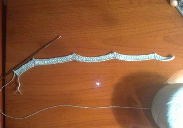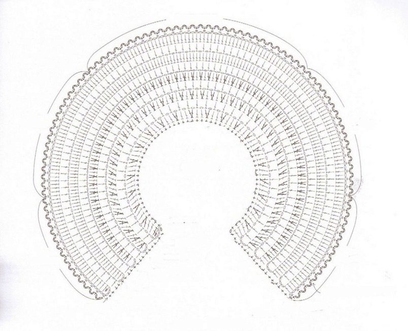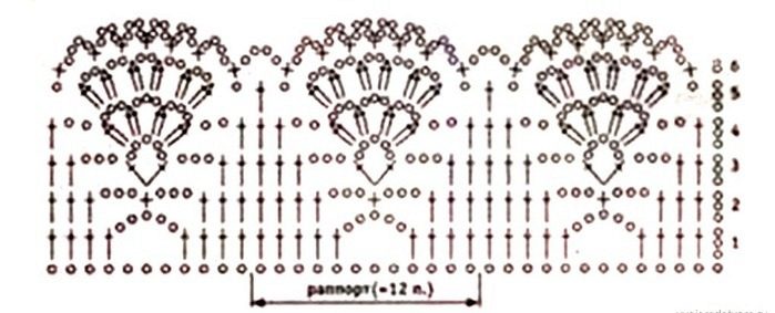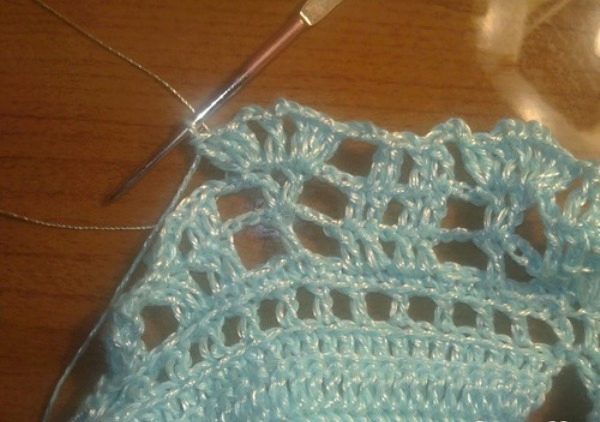 - The next 8-10 rows also knit, 3 lifting loops, 10 pillar. with double crochet, "shell", where 2 double crochets fit in the 1st air. loop of the first row, 2 vozd. Clause and 2 pillar. with double crochet, knit in 2nd vozd. p. 20 pillar double crochet, etc.