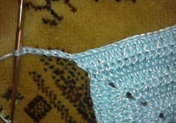 - Start the first row with a double crochet. After knitting 10 loops, tie a "shell", that is, in the 11th tie a 2 pillar. nakidom, 2 vozd. and in the 12th loop also knit 2 pillar. with a crochet. Due to this, the row will become square. Repeat the "shell" three times through 20 loops and complete the row with the 10th pillar. with a crochet.