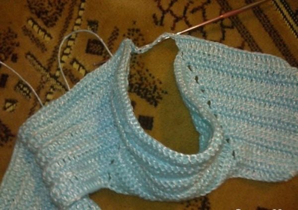 - Knit the front side and connect the yoke into the second armhole. Having tied up the second half of the back, combine the work in a circle.