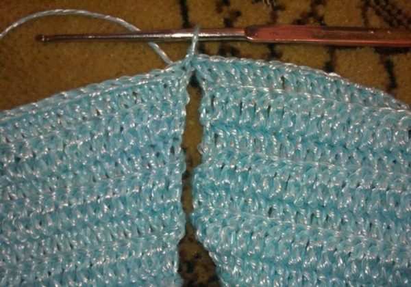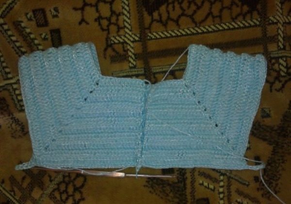 - Tying yoke, proceed to the armhole. Tie 10 crochets to the first shell, 2 pillar. double crochet in 1st vozd. n. the previous row, 7-9 air. p., skip the side and make 2 double crochets in the 2nd air loop of the second arch-shell of the previous row.