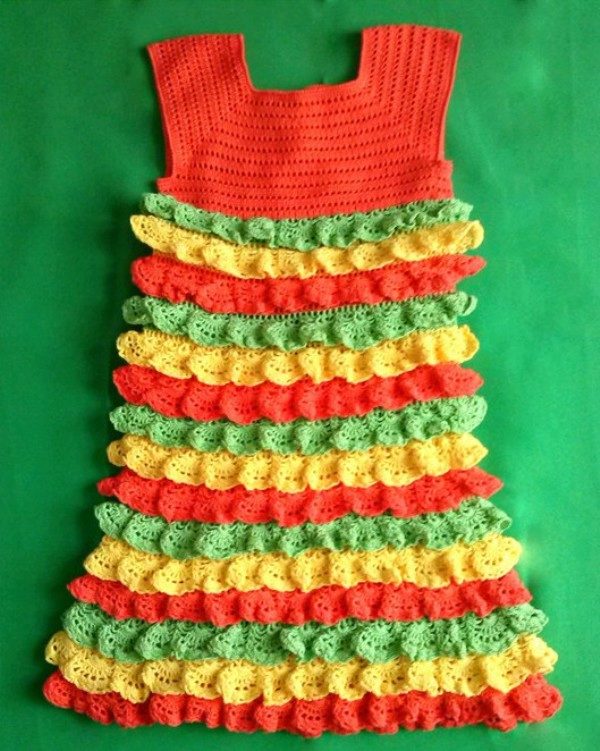 According to the principle described above, the summer dress with frills is knitted, only the yoke is replaced with a bodice with shoulder straps.