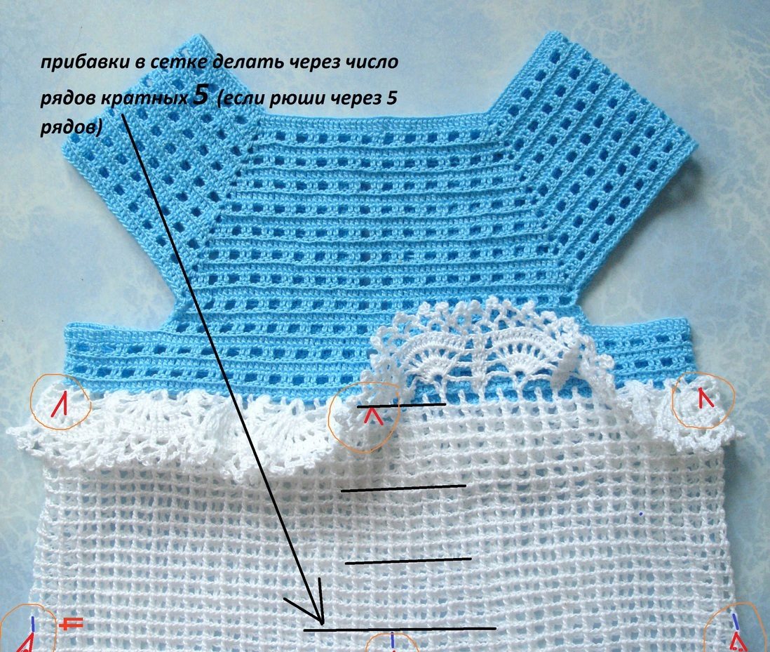 Having connected the armhole, in the next row, get the right amount of air loops in the armpits according to the size of the chest circumference. And continue to knit with a grid (double crochet, 2 vozd. Loops), making expansion in rows at regular intervals. If the ruches are knitted in every 5th row, then the length of the product should be a multiple of 5.