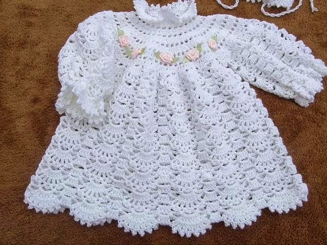 For christening you need a dress of free cut and in white colors, which symbolizes the purity of the child. Below is a model with an openwork pattern and sleeves perfect for such an occasion.