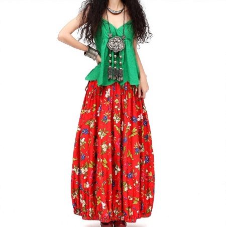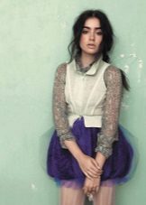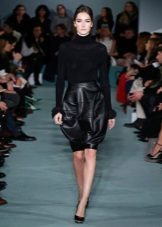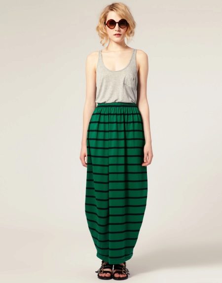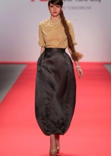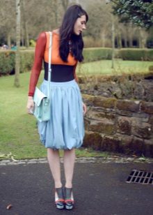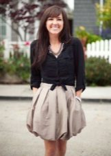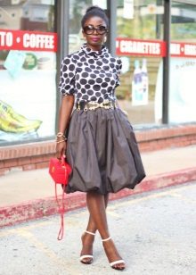 A distinctive feature of the balloon skirt is a loose fit.And to the spacious bottom you should always choose a fitting top, because this is the only way to avoid the sphericity of the silhouette. T-shirts and blouses, sweaters and jackets can be combined with this style.
