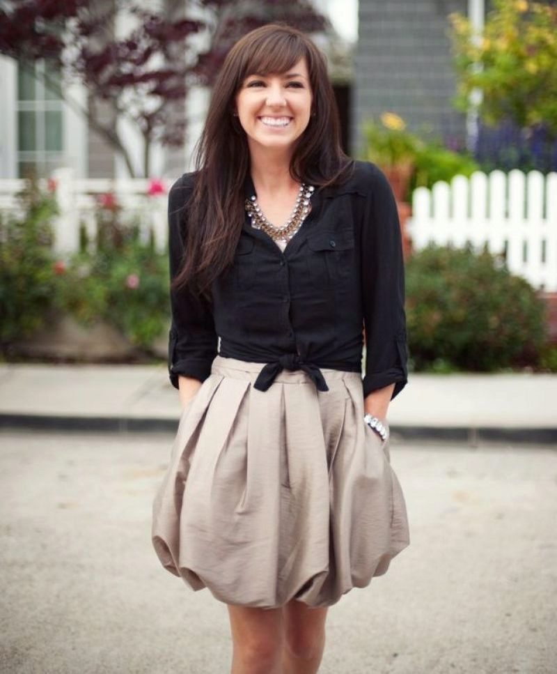 The balloon skirt can be presented in different colors, you can completely rely on your taste when choosing them. However, dark colors are the most popular colors: brown, black or blue.