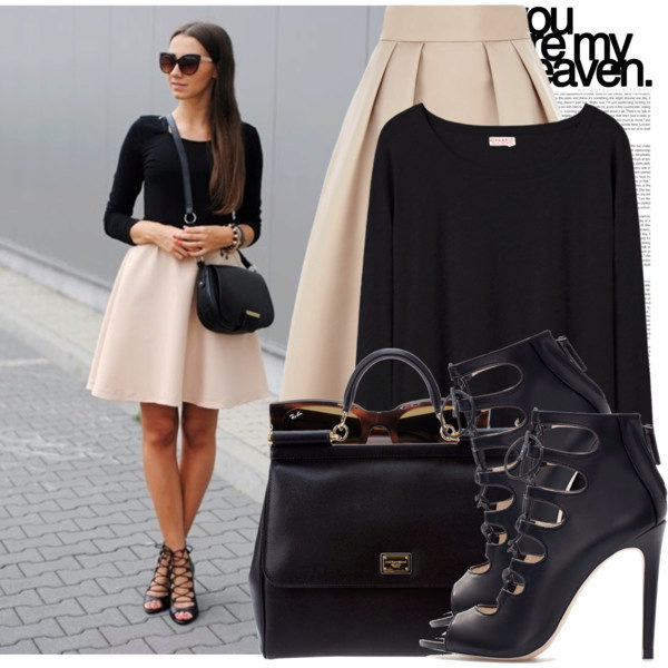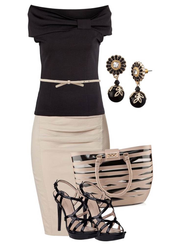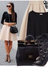 This color combination looks harmoniously, strictly and especially often chosen by brunettes. In a beige skirt, complemented by a black chiffon or silk blouse, you can go to a party, not forgetting to include black stiletto sandals, a neat clutch and eye-catching decorations. The beige and black ensemble is also suitable for everyday use.