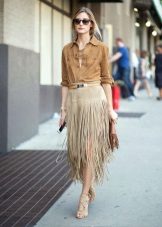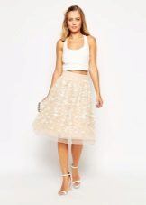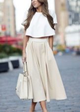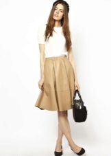 Beige skirts of this length are presented in different styles. Most often these are flared models, but pencil skirts to the knees are no less popular. They are combined with high-heeled shoes. In this skirt you can create both business and casual ensemble.