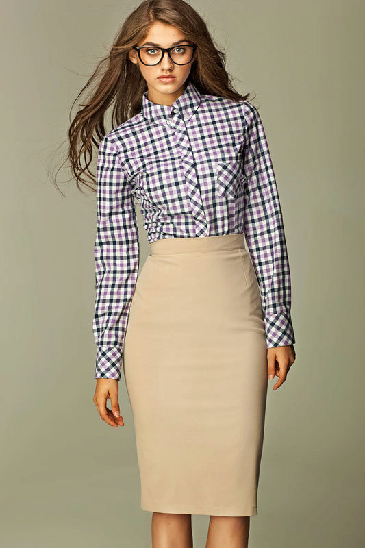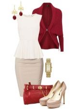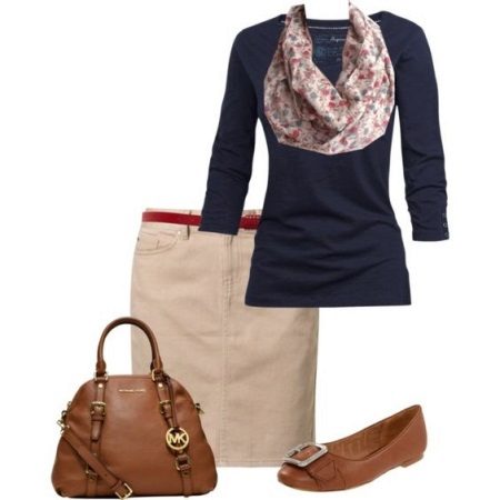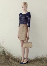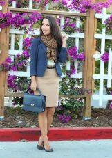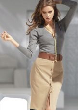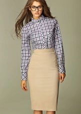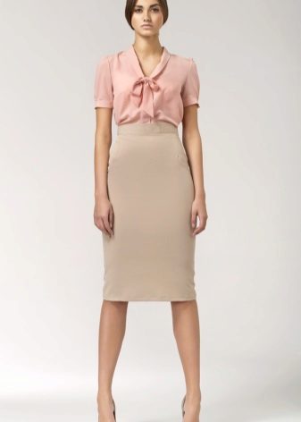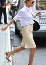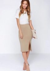 Beige pencil skirt to create an office bow can be combined with shirts or blouses in white or some shade of pastel. In cool weather, a white or beige jacket can be worn. Such a strict skirt can be complemented with a brown belt and a brown envelope bag, as well as bodily boats.