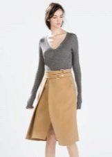 Skirt beige straight cut is the perfect choice for office everyday. It is usually combined with a strict top, for example, with a white blouse or shirt. Also a good choice for this skirt will be the top, made in the same color palette.