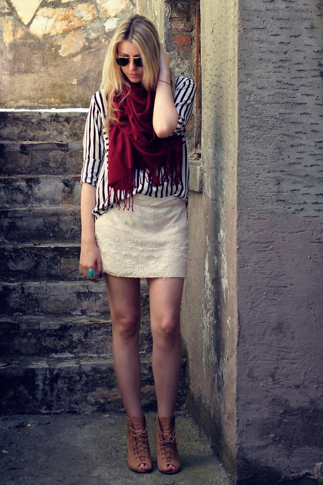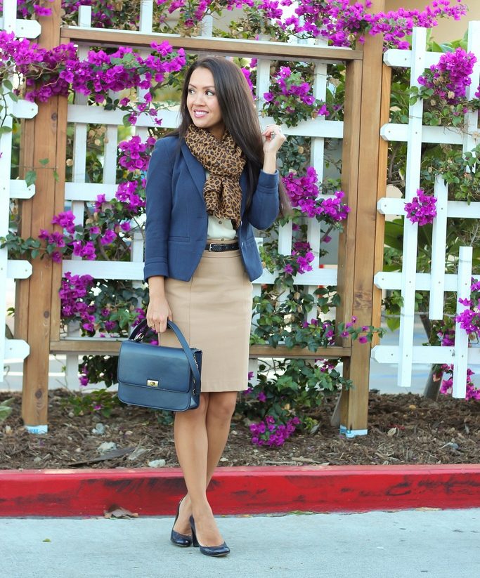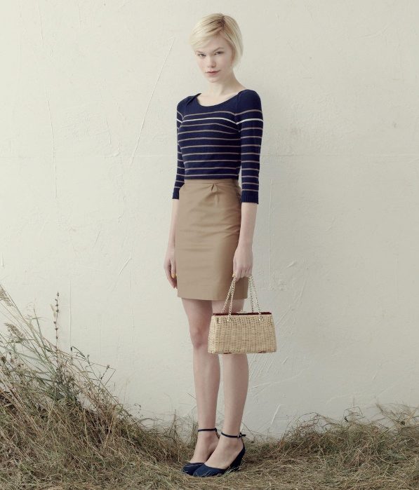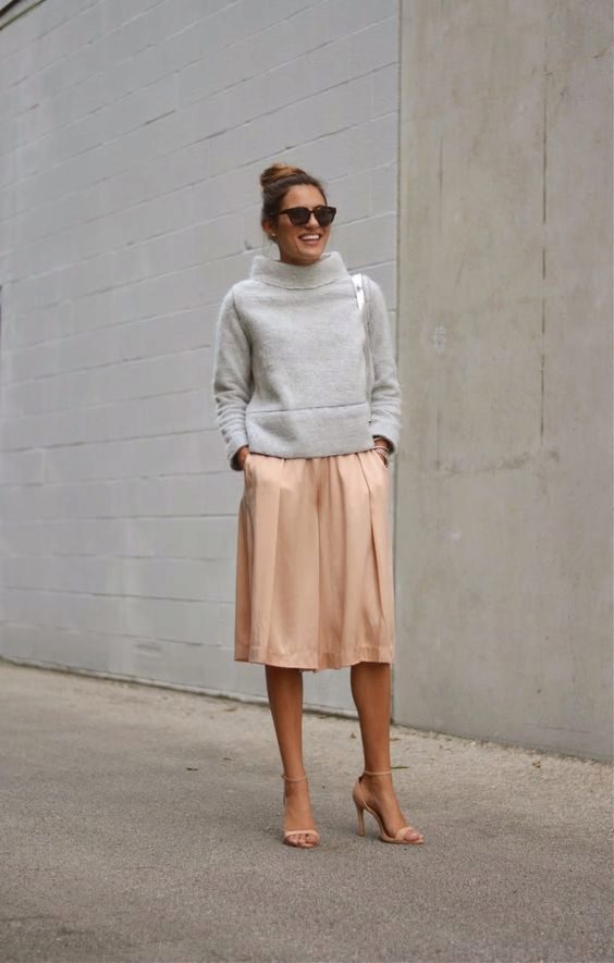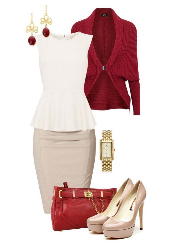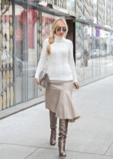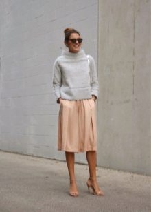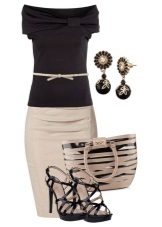 If a beige pencil skirt is put on for a walk, a jumper, a cropped top or a turtleneck can be her “companion”. Shoes to such an ensemble can be represented with high-top sneakers and stiletto sandals, and jewelery is better to choose in gold or brown.