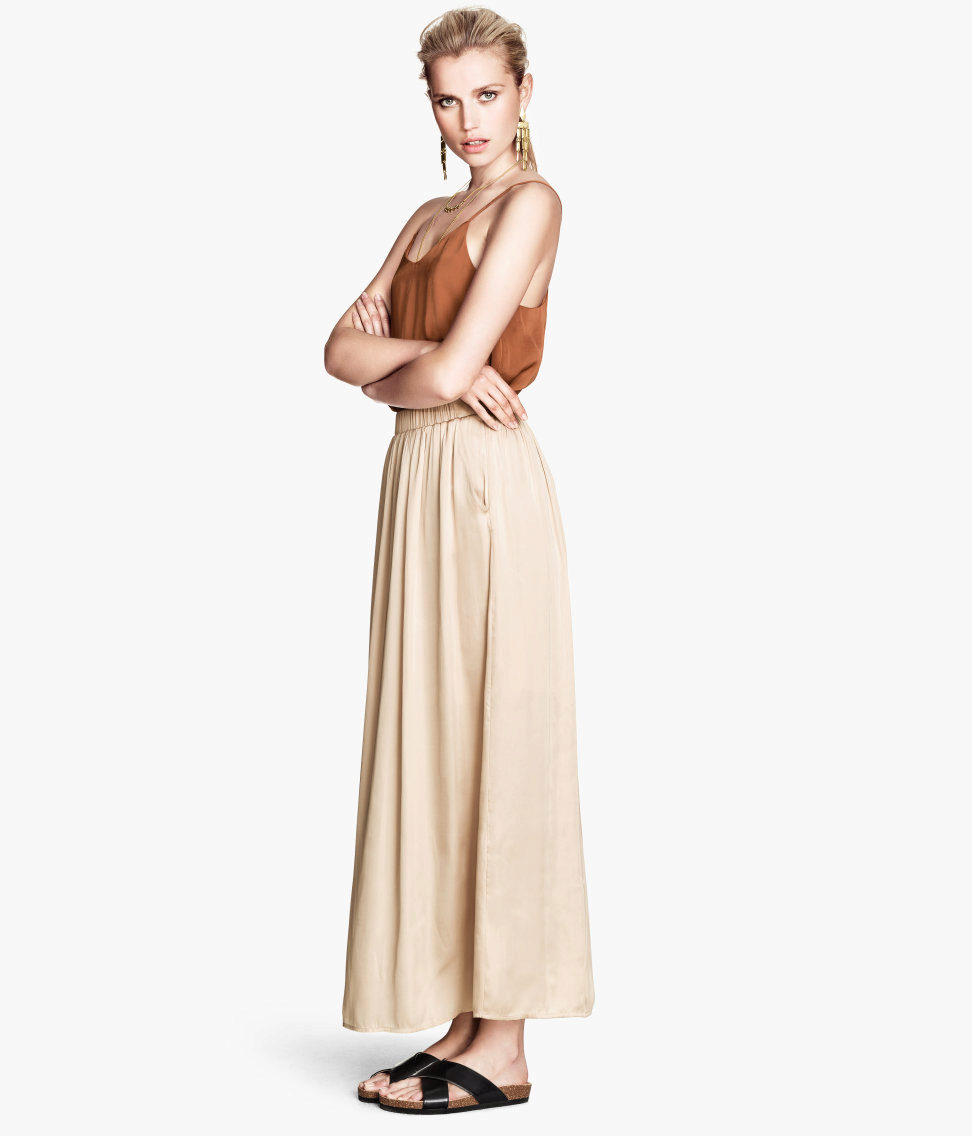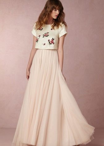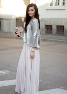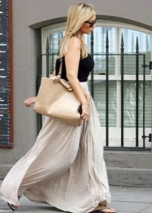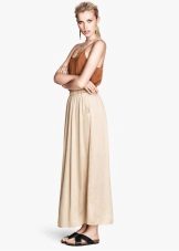 Whatever the material of these skirts, they look light and calm. To the long skirts beige most often choose a bright top or fitted blouse or shirt in pastel colors. Appropriate rude wardrobe items such as leather jackets and cowboy boots are suitable for such skirts. A nice addition to a beige skirt to the floor is a jacket of bright or neutral color. Looks attractive beige skirt with a top on the straps of any saturated color, for example, indigo or emerald.