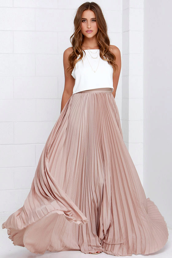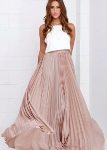 The most popular beige pleated skirts made in the midi length. These are stylish and attractive models that combine well with both a crop top and a vest. In cool times, a pleated skirt can be complemented with a leather jacket or cardigan, and shoes should be chosen in a bright shade or with a print.