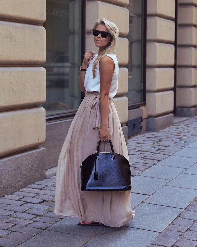 A nice addition to long beige skirts is a lace top or a delicate blouse. If cool, this skirt can be combined with a simple white or cream jumper. Looks elegant long skirt in beige color, worn with a white shirt.