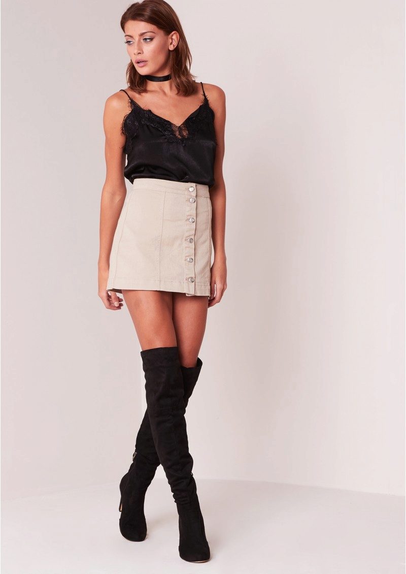 However, a denim beige skirt can also be the basis for a strict look if it is the right length. Wearing it is worth with blouses.