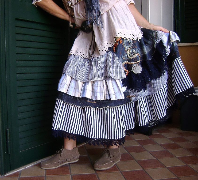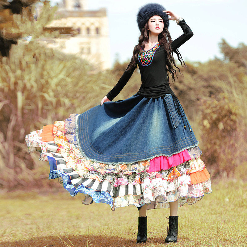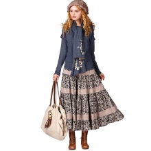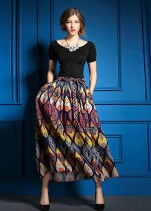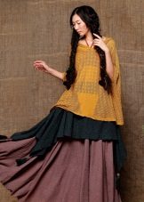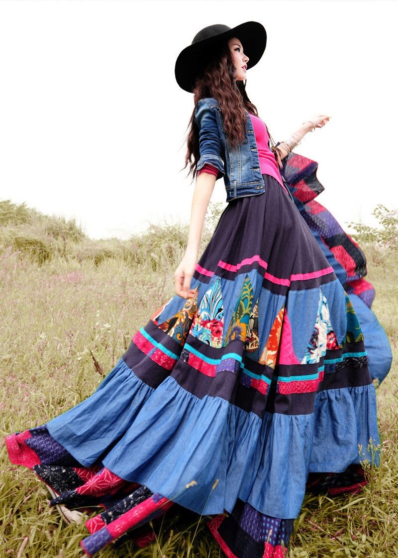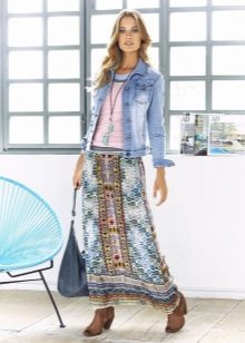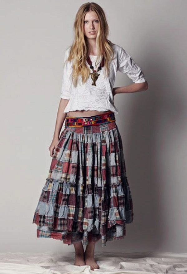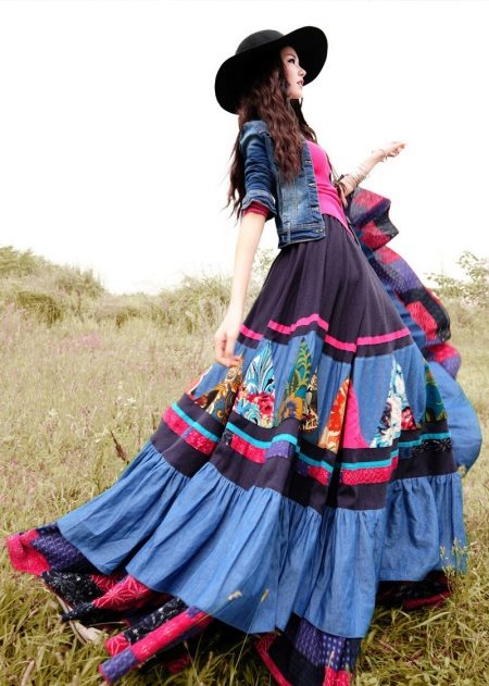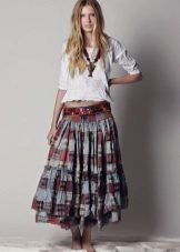 - Combined skirts – boho. Bold combinations of various fabrics (for example, the hem of a plain skirt is decorated with inserts with a small ornament of bright color). Or a combination of scraps in one product.