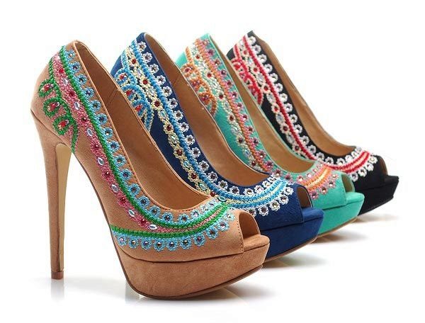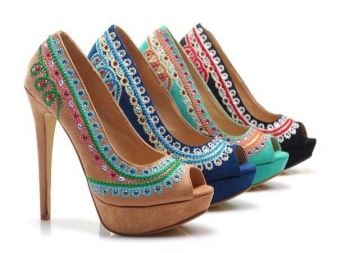 Shoes here are appropriate expensive - leather or suede; blotches of textiles are possible. Shoes are decorated with lacing, locks, rivets, inserts of fabric, beads, embroidery. Shoes can be with flashy stones.