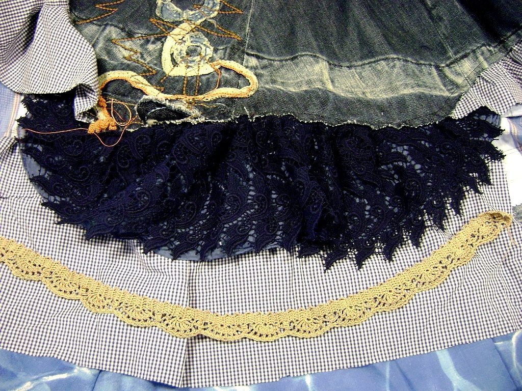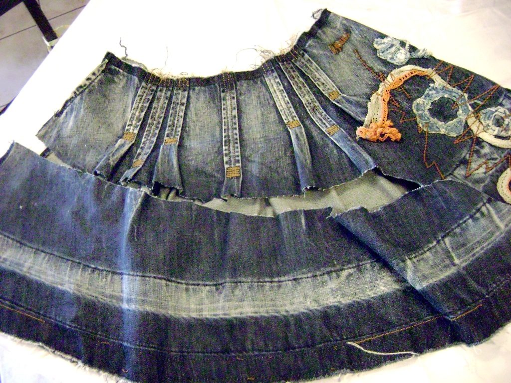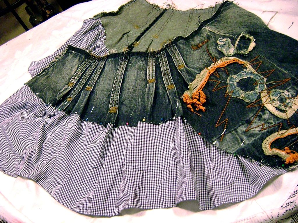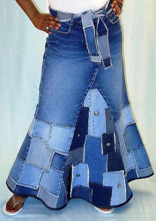 Even easier - we cut off old jeans, sew in the form of a skirt and attach pieces of multi-colored fabric to the hem, the more pieces, the more fashionable and creative. That is the style - boho.