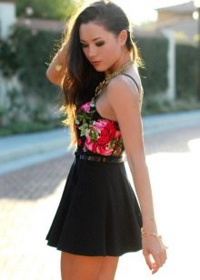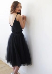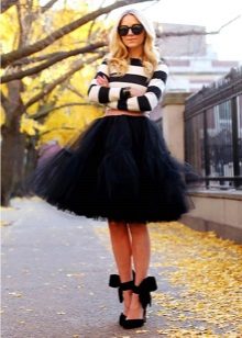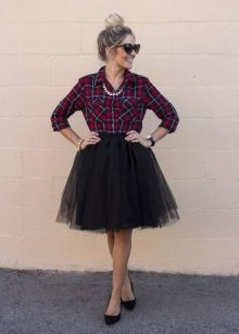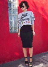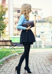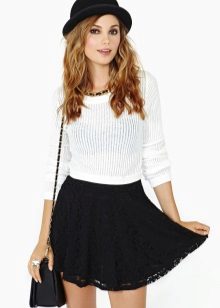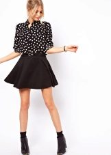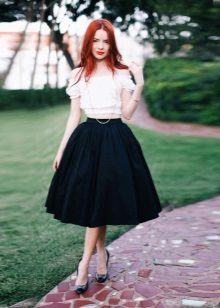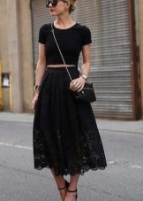 A black skirt can be complemented with a T-shirt, blouse, T-shirt, cropped top or sweater. Usually the top is tucked into the skirt, emphasizing the waist. One of the successful additions to a black skirt-sun is considered a denim shirt