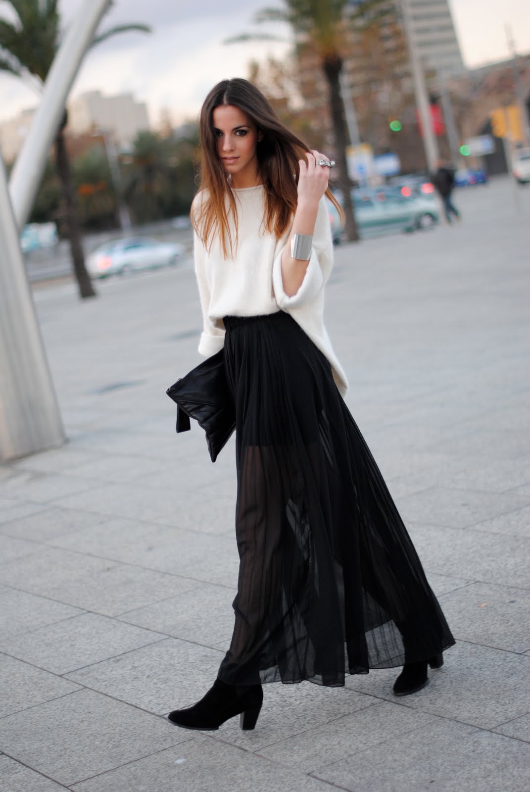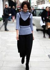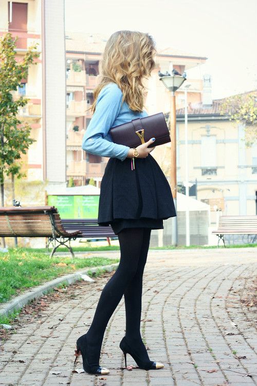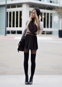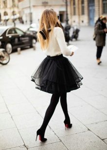 In addition, a long black skirt is often chosen for the winter period. In this case, it is combined with a light sweater or blouse with long sleeves, tight tights and high boots.