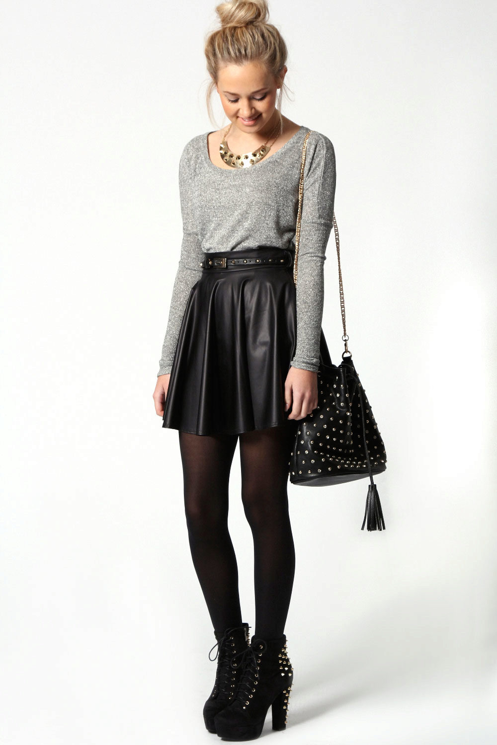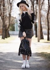 For a bold and slightly brutal look, black satin corset and cropped leather jacket are worn to a black leather skirt, complementing the outfit with massive shoes or sneakers.