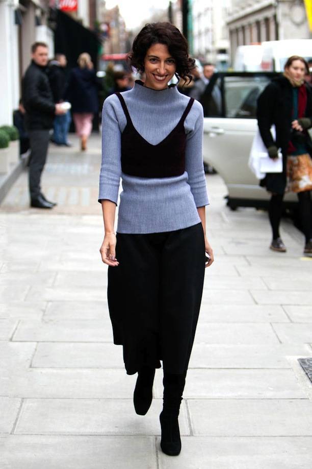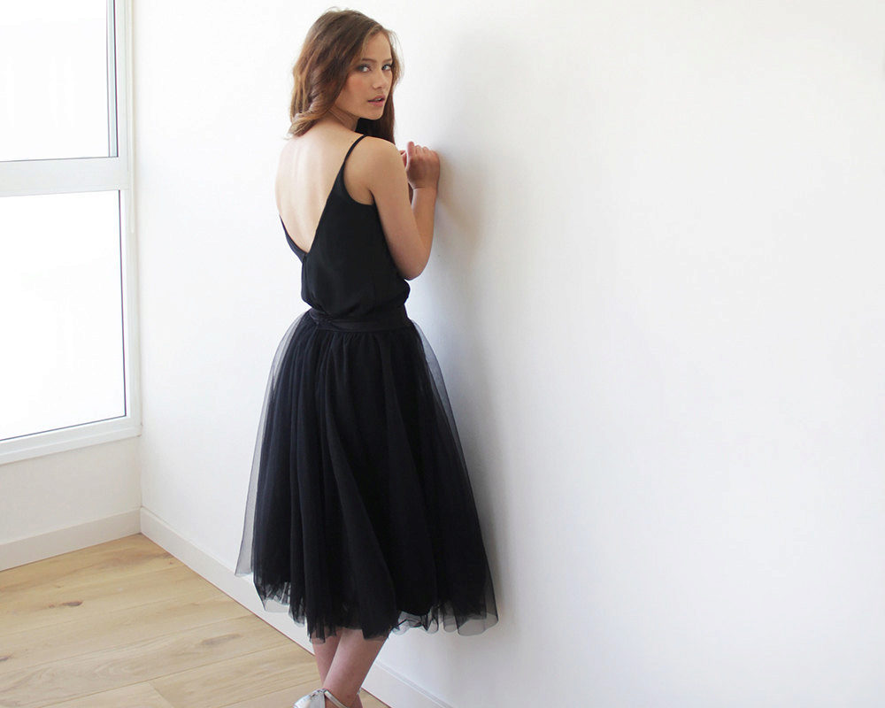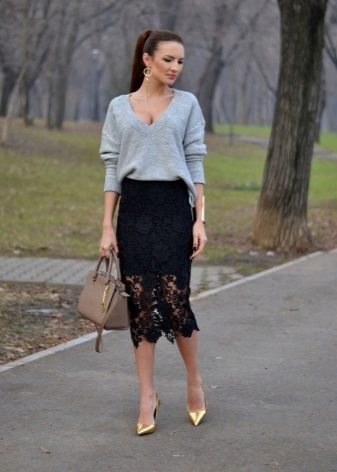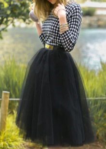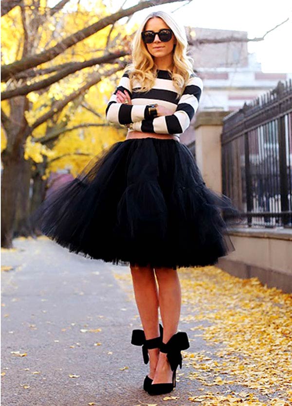 The lush black skirt looks good with a delicate blouse, sweater, and any other top that fits the figure. If it is a guipure or multi-layered chiffon skirt, you can choose a top for it in a delicate pastel palette. In cool weather, you can put a waistcoat or a fitted jacket on top.