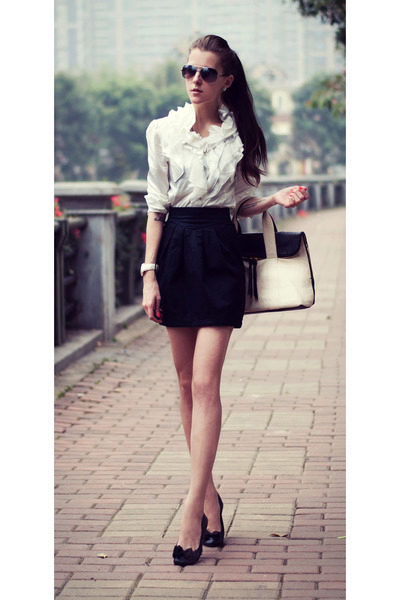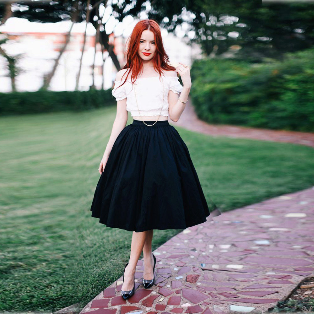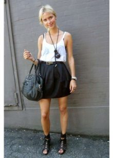 Strict versions of black skirts complement the restrained top, the color of which is most often white or pastel palette. Such skirts are worn with shirts, blouses, jackets, turtlenecks, thin sweaters, cardigans and sweaters. Shoes are selected depending on the style of the skirt and its length, and the accessories used are often discreet. In everyday use, the black skirt combines well with bright T-shirts, cropped tops, riding with an unusual print, polka-dot and striped blouses, massive bracelets, bright envelope bags or voluminous leather bags. Shoes include ballet flats, espadrilles, sandals without heels, sneakers, and even sneakers.