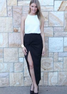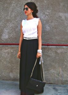 A good romantic combination will be the addition of a black skirt with a top made of silk fabric, as well as a small clutch bag and shoes with thin high heels. Long black skirts complement a bright top, ballet flats or flat sandals. From accessories to such skirts usually pick up a small bright clutch and a few catchy decorations.