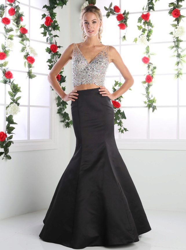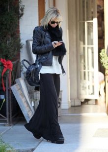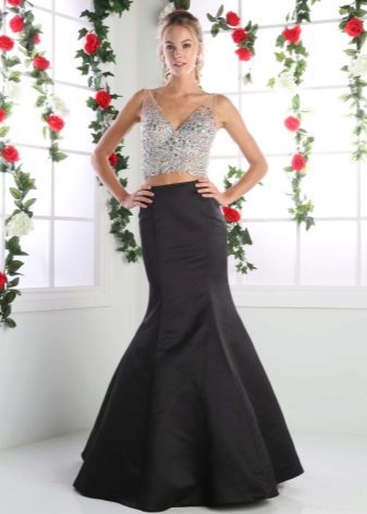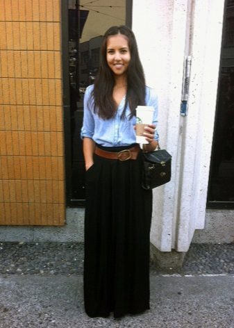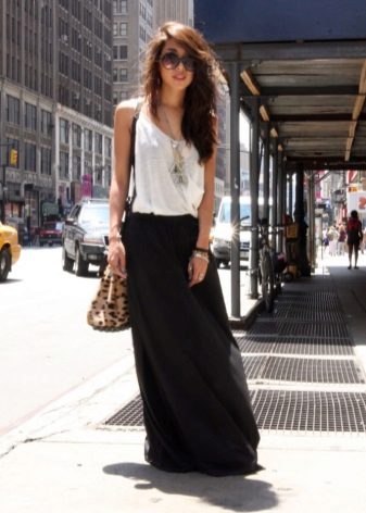 The best addition to the long black skirt is a top with a bright print, for example, in a striped or flower. For a glamorous look, a long skirt is combined with golden or other expressive tops, as well as sparkling volume jewelery.