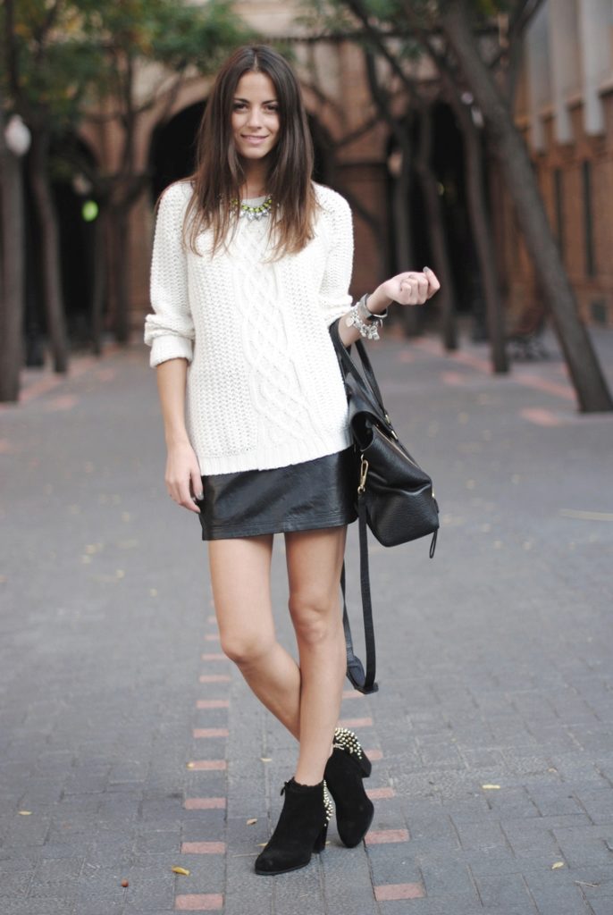 To get the official bow for everyday life in the office, leather midi length skirt should be supplemented with a white chiffon blouse and black boats.
