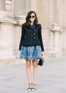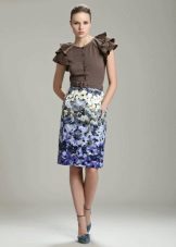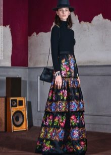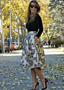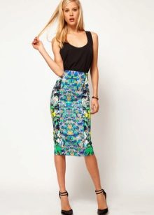 The best combination of clothes will turn out with a fitted top - for example, a black top or a T-shirt. A blouse of warm white color will add tenderness to the look. You shouldn’t choose very bright jewelry - here prints on the skirt play this role.