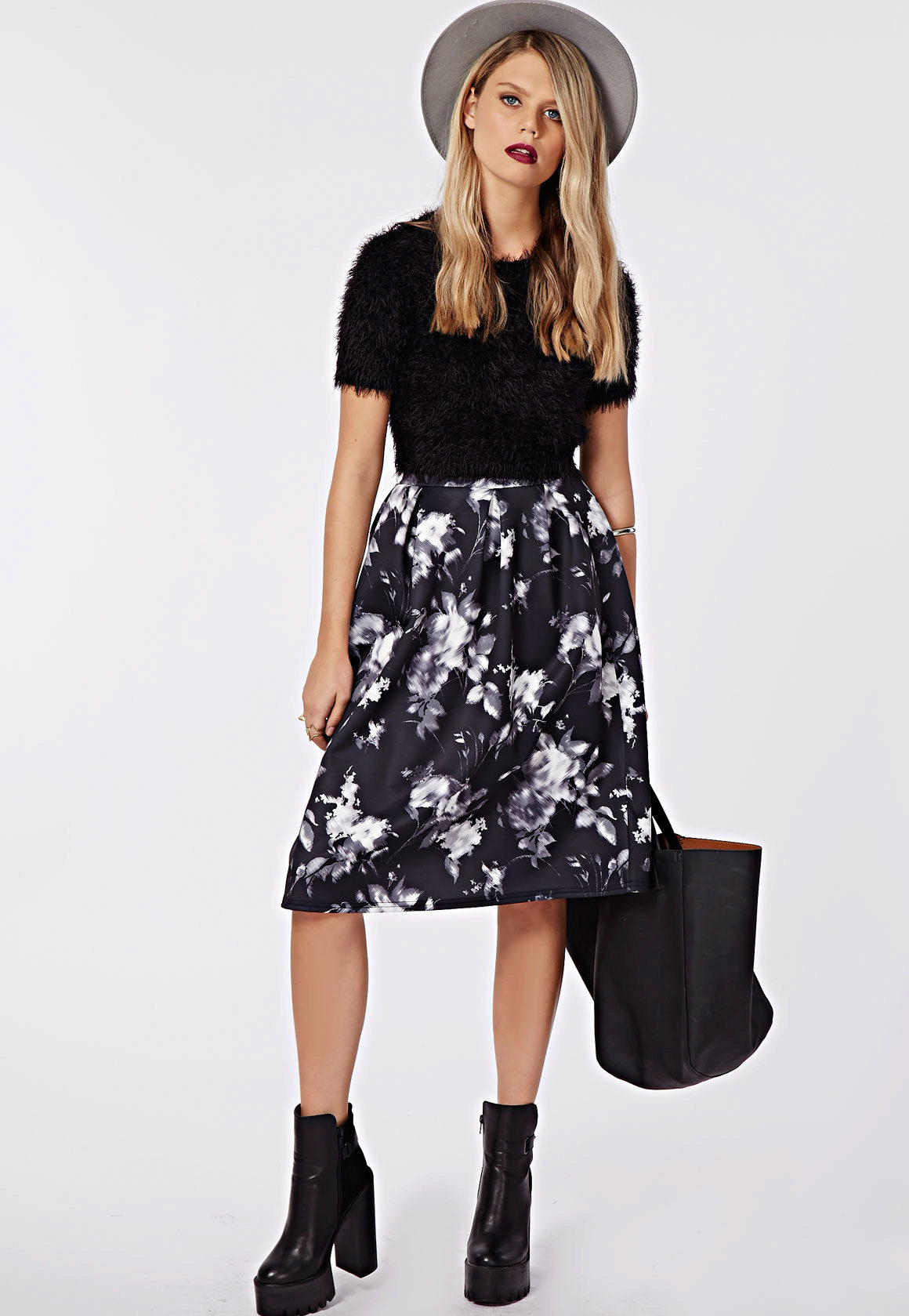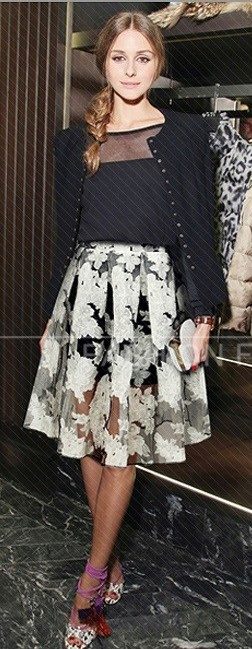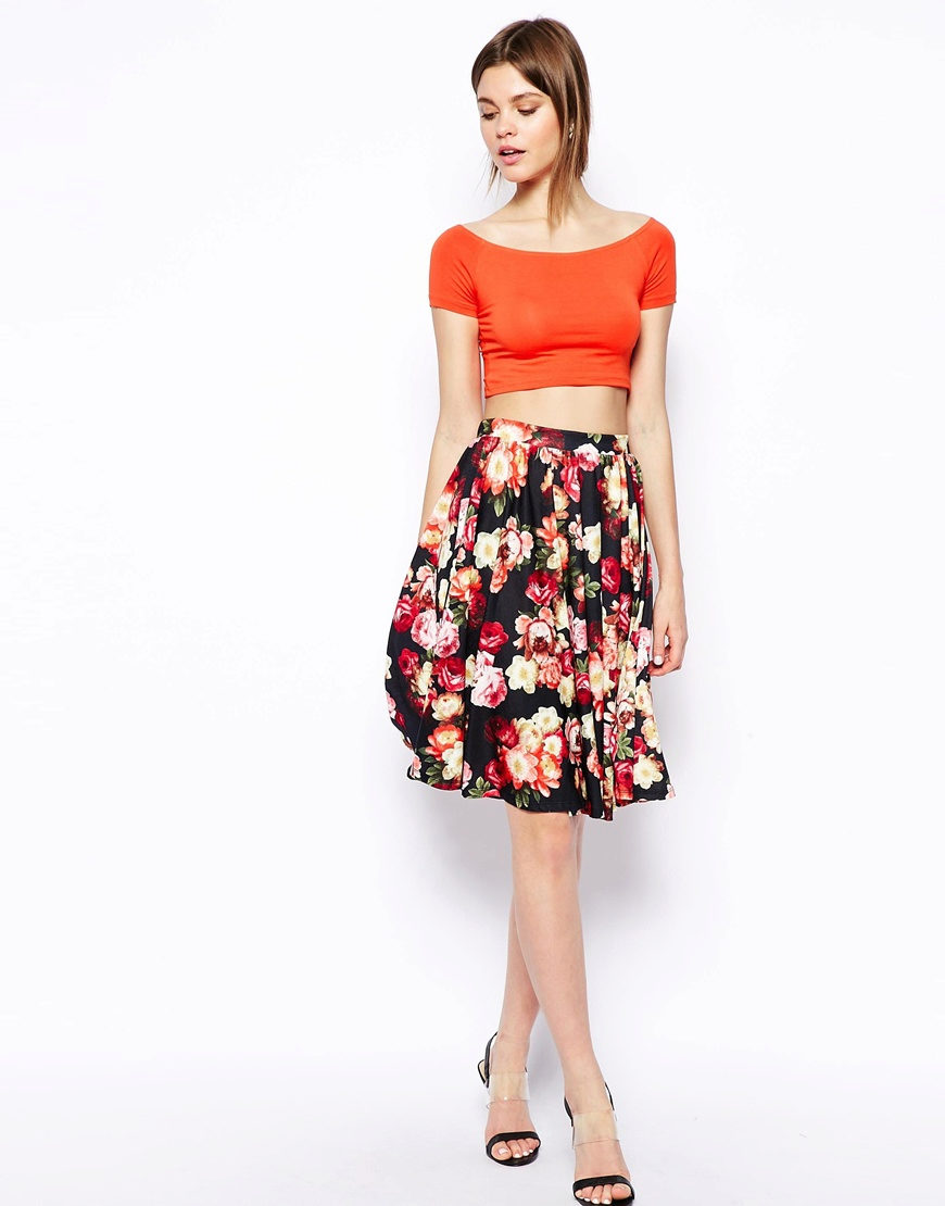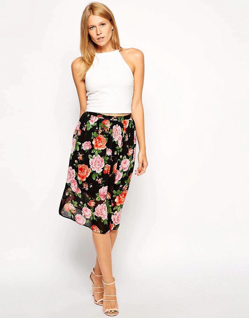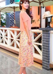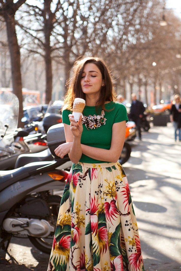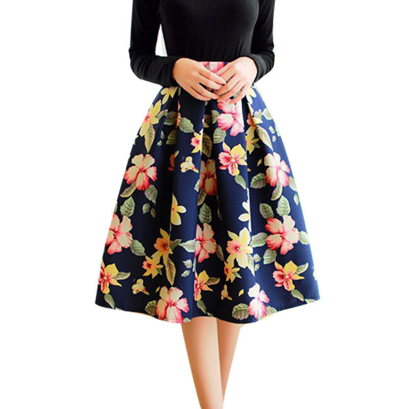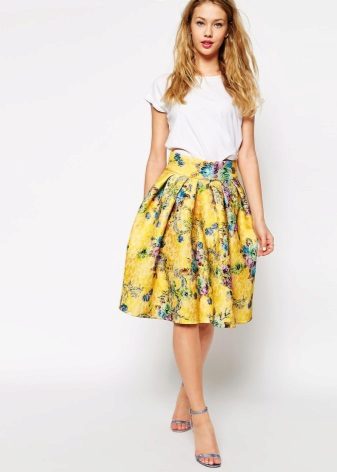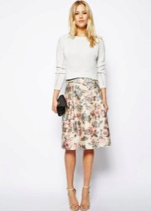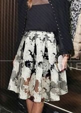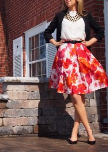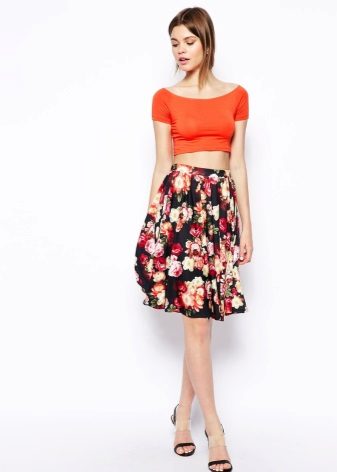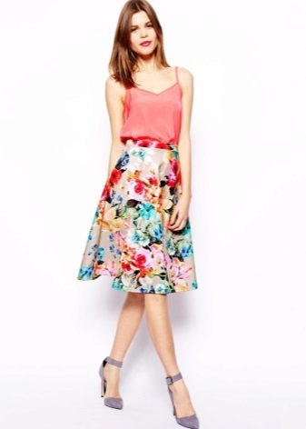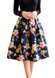 Knee-length floral skirts are incredibly popular. Regardless of the colors, they make the look of their mistress very feminine and elegant.