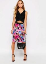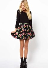 If the main color in a colorful skirt is black, then it will help to visually reduce the volume. In combination with a print in a small bright flower, the color will be highlighted first, and only then the figure of the girl. But this will not lose face. This combination has become a favorite with many girls who consider their figure not perfect.