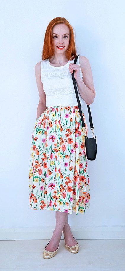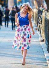 When going to work in such a skirt, a discreet contrasting top will be most welcome - a white blouse or a plain light jumper, and for walks and fun activities you can wear a bright top, maybe even consider the option of a top to match the main print.