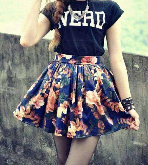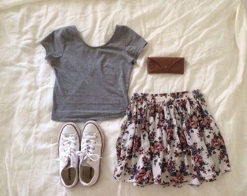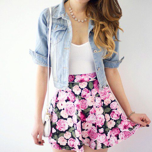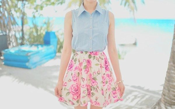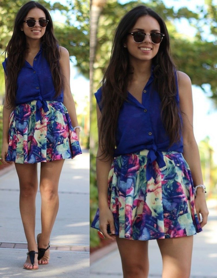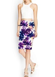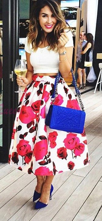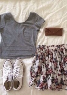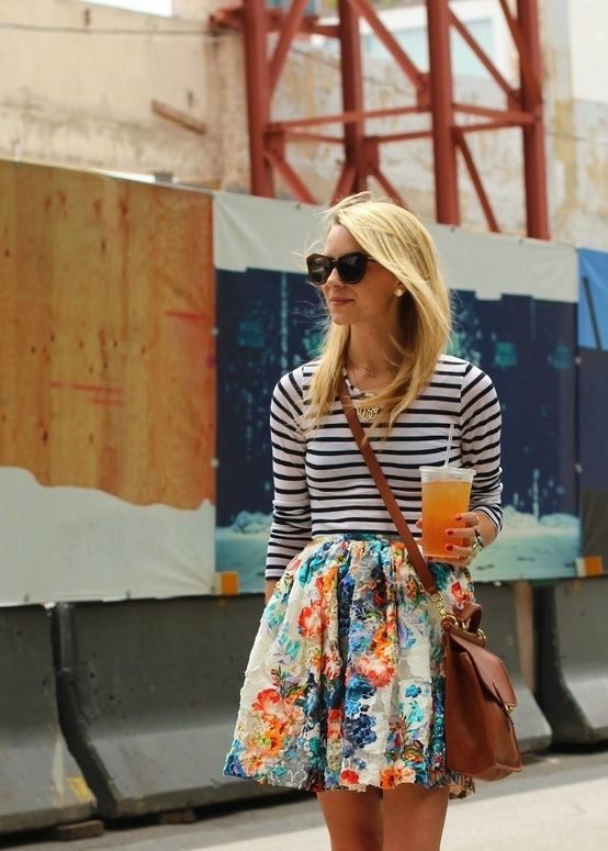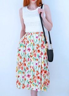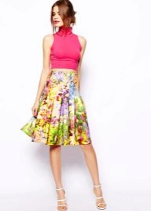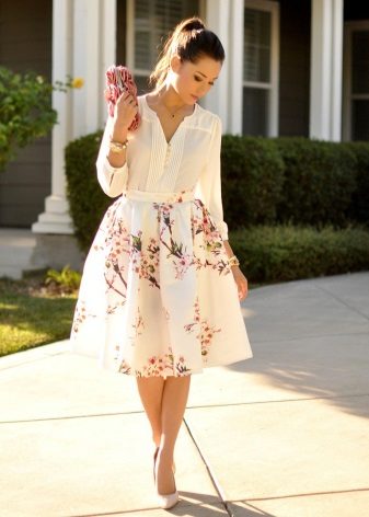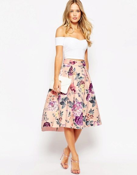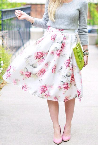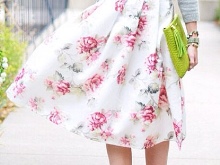 A floral print skirt can make a bright and summer-like look out of any ordinary bow. It is only important to choose the right combination of length and style so as not to flaunt the flaws of your figure along with the brightness.