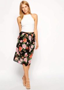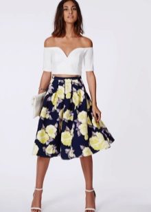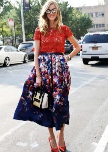 The choice of all other things in a bow with a floral skirt should be made on the basis of the principle of combining bright with monochromatic. For example, a skirt with a red floral print goes well with a white or black top, and yellow flowers are in harmony with a plain brown top. Those. There is only one accent in the image - this is a bright skirt, and in order not to turn into a “summer glade”, when choosing things the rule is to be followed.