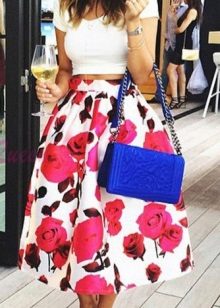 To add mood, you can use small details, such as small wrist watches to match the top. From jewelry will look interesting to earrings in the form of a flower depicted on the skirt. The main thing is that their size does not exceed 3 cm, otherwise the priority of the main subject, the skirt, can switch to them.