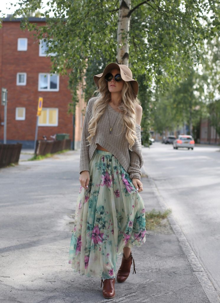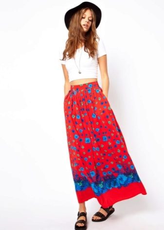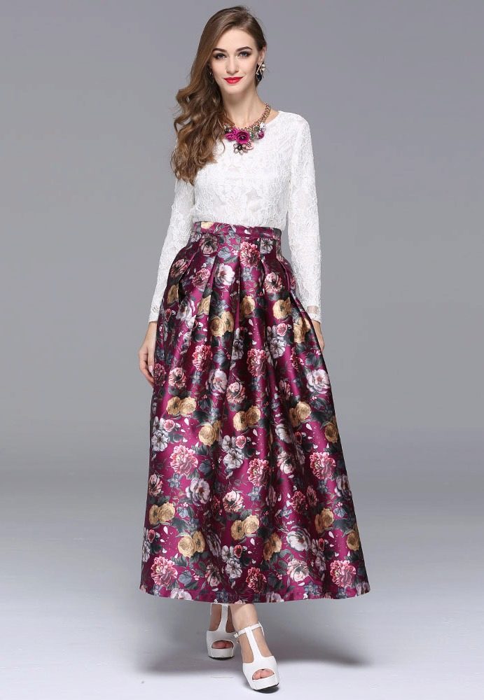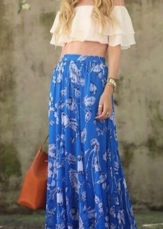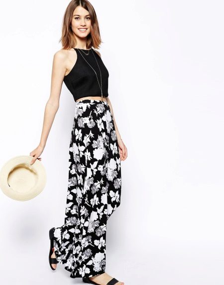 A long skirt with a floral print looks very fresh and simple. To create an ideal image that does not visually spoil the shape, you need to keep track of the proportions. The length of the skirt will hide the flaws in the shape of the legs, if any, and the high seating will highlight the waistline.
