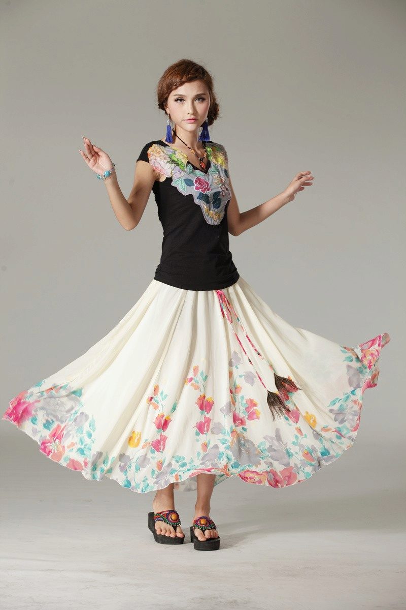 When choosing colors, you should be guided by the rule - “large - small” and vice versa. That is, if your skirt is floor-length, then it will be best to look at it with many small flowers, and if you opted for a mini-skirt, then you should pay attention to the styles of skirts with large flowers. Following this advice, in the “sun” style, wide hips are hidden and narrow visually enlarged.