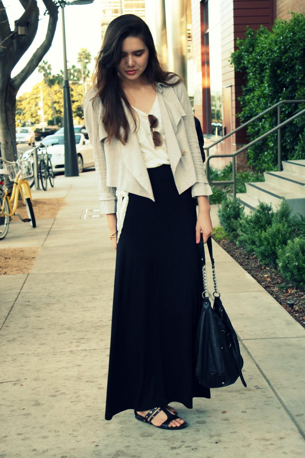 Long black skirt can transform a strict office outfit. In this case, your appearance will match the official dress code. To do this, wear a white or beige shirt.