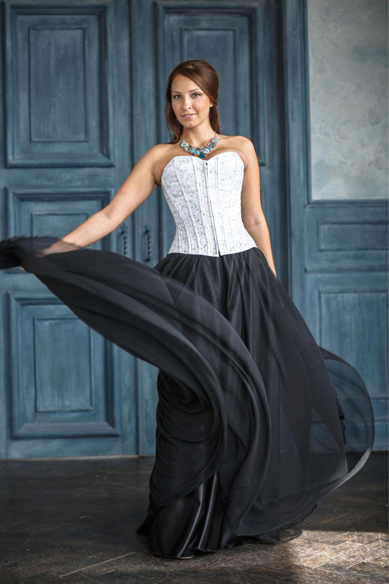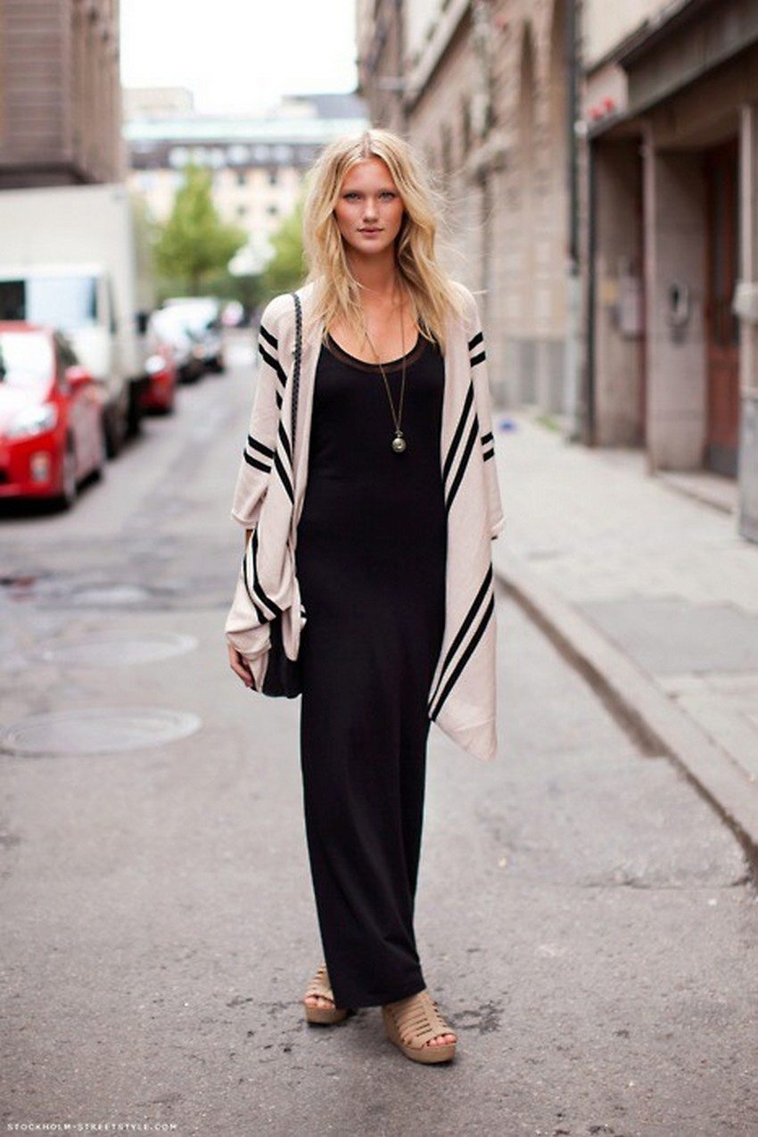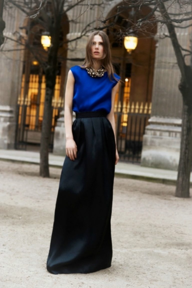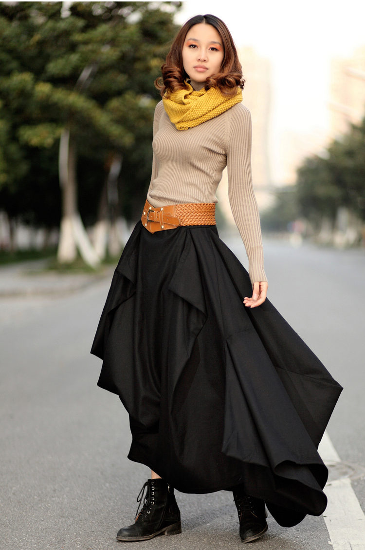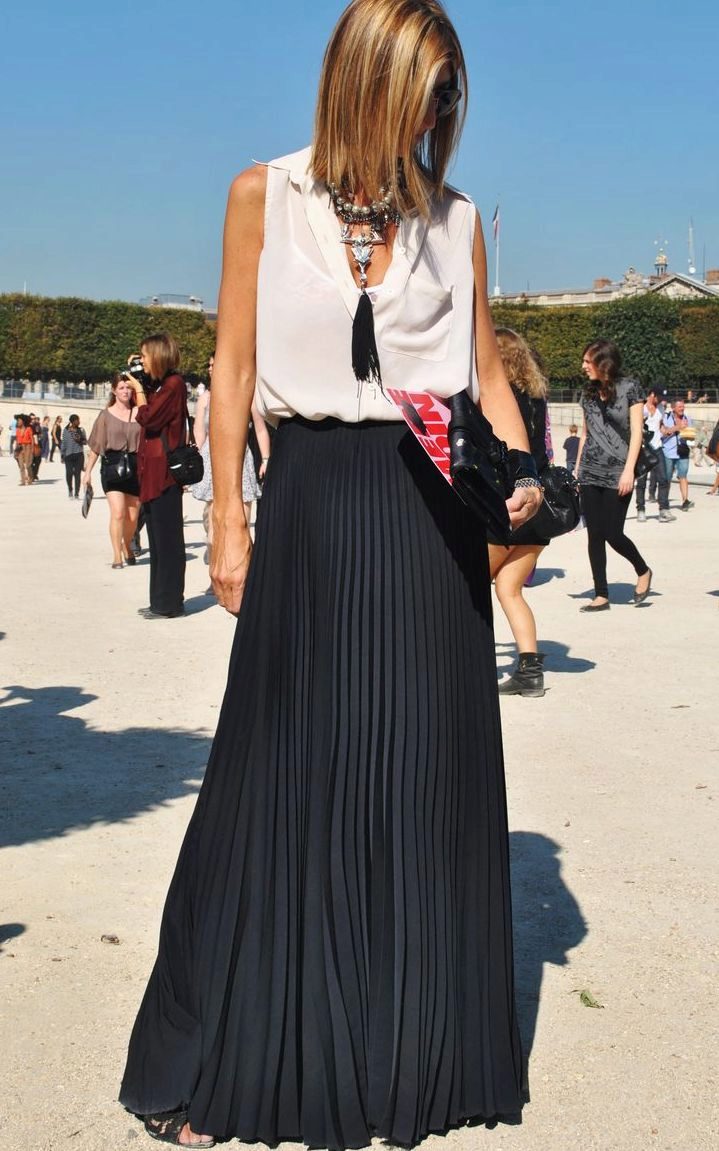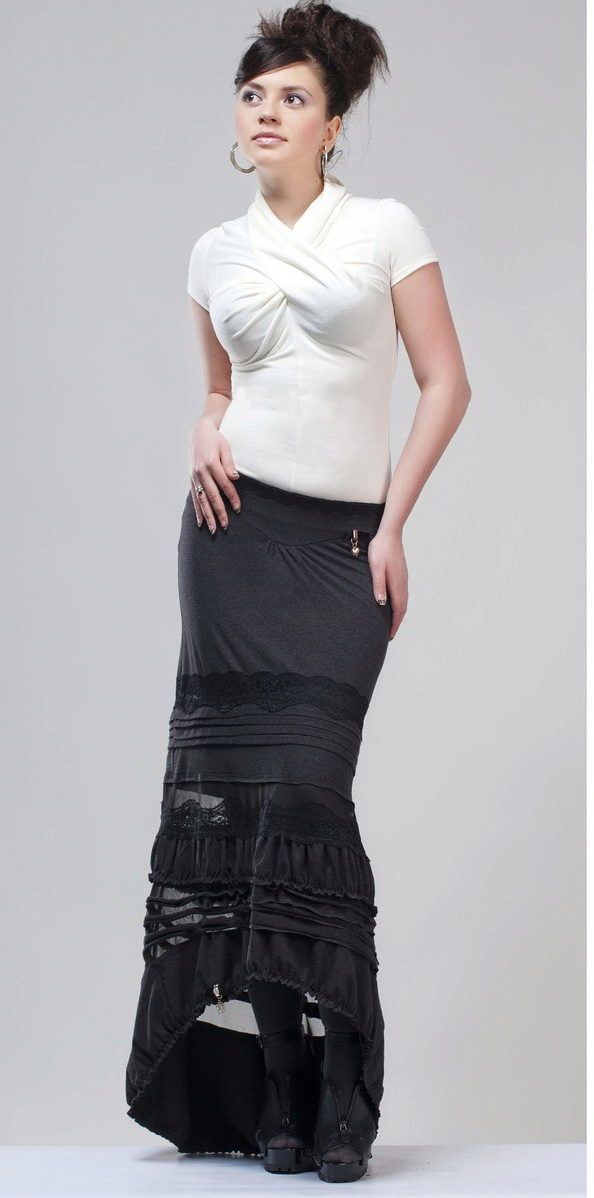 A long black skirt can give it a pleasing feel. The abundance of folds looks feminine and beautiful. But, choosing the top, keep the balance: to the fluffy skirt you should not wear the same volumetric top. Otherwise, your image will be just grotesque.