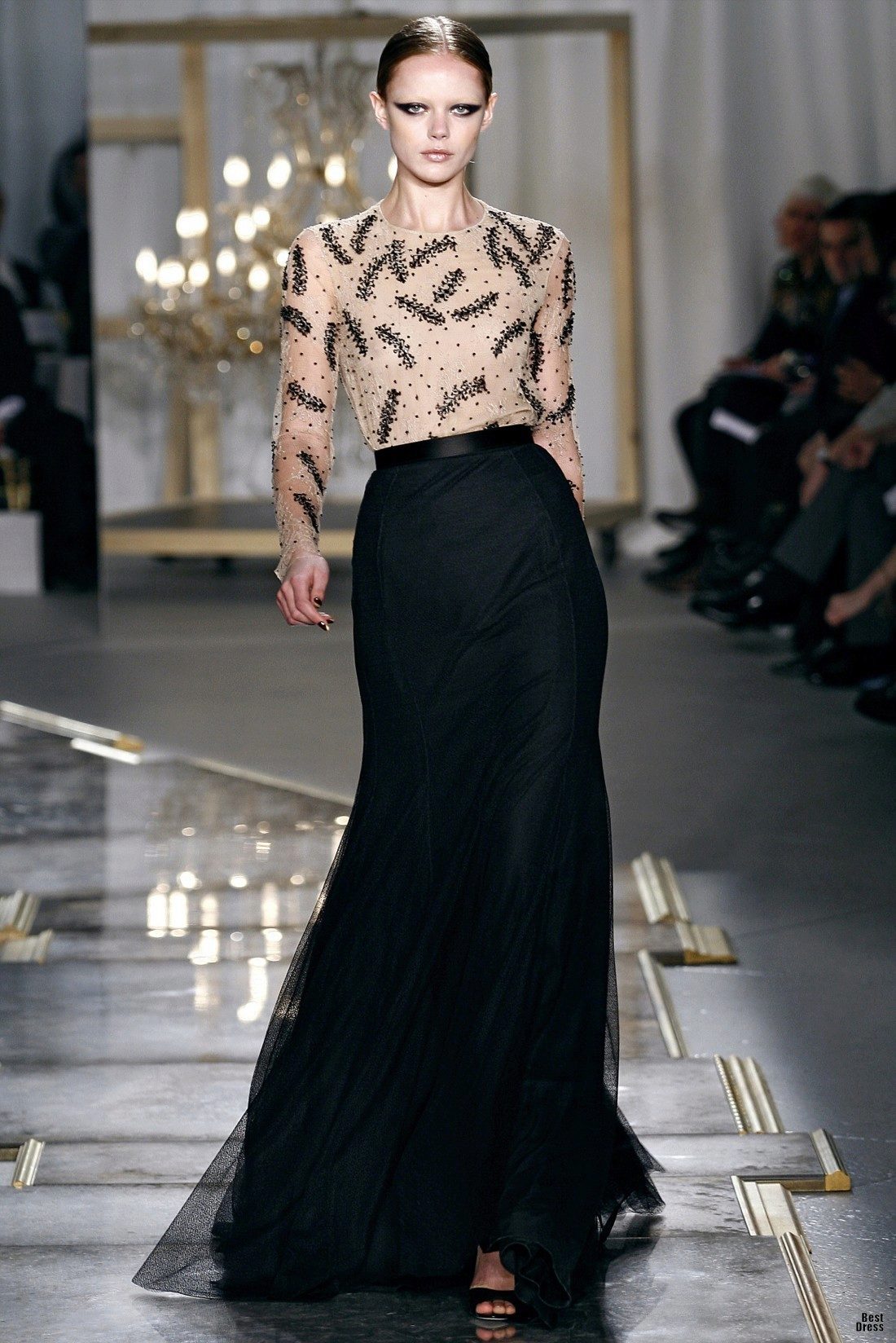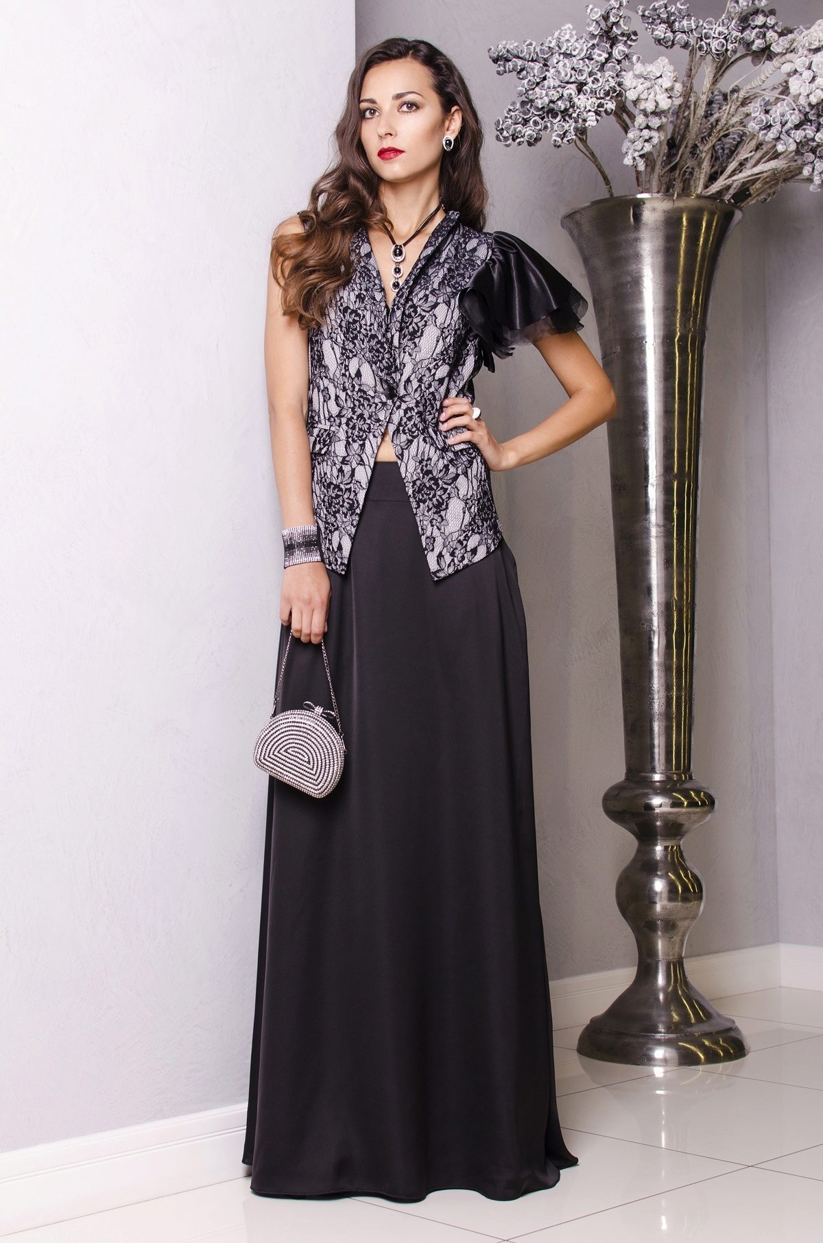 Without accessories, any bow looks dull and boring. They are able to bring a touch of zest, femininity and personality. Both classic gold chains and necklaces, as well as massive bracelets and necklaces that create a glamorous look will suit the long black skirt.