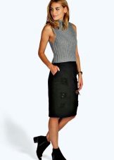 The pencil skirt usually has a semi-fitting, slightly tapered silhouette and a length to the middle of the knee. It goes well with both business wardrobe items - shirts, blouses, turtlenecks, jackets, and casual clothes - T-shirts, tops, sweaters, etc.