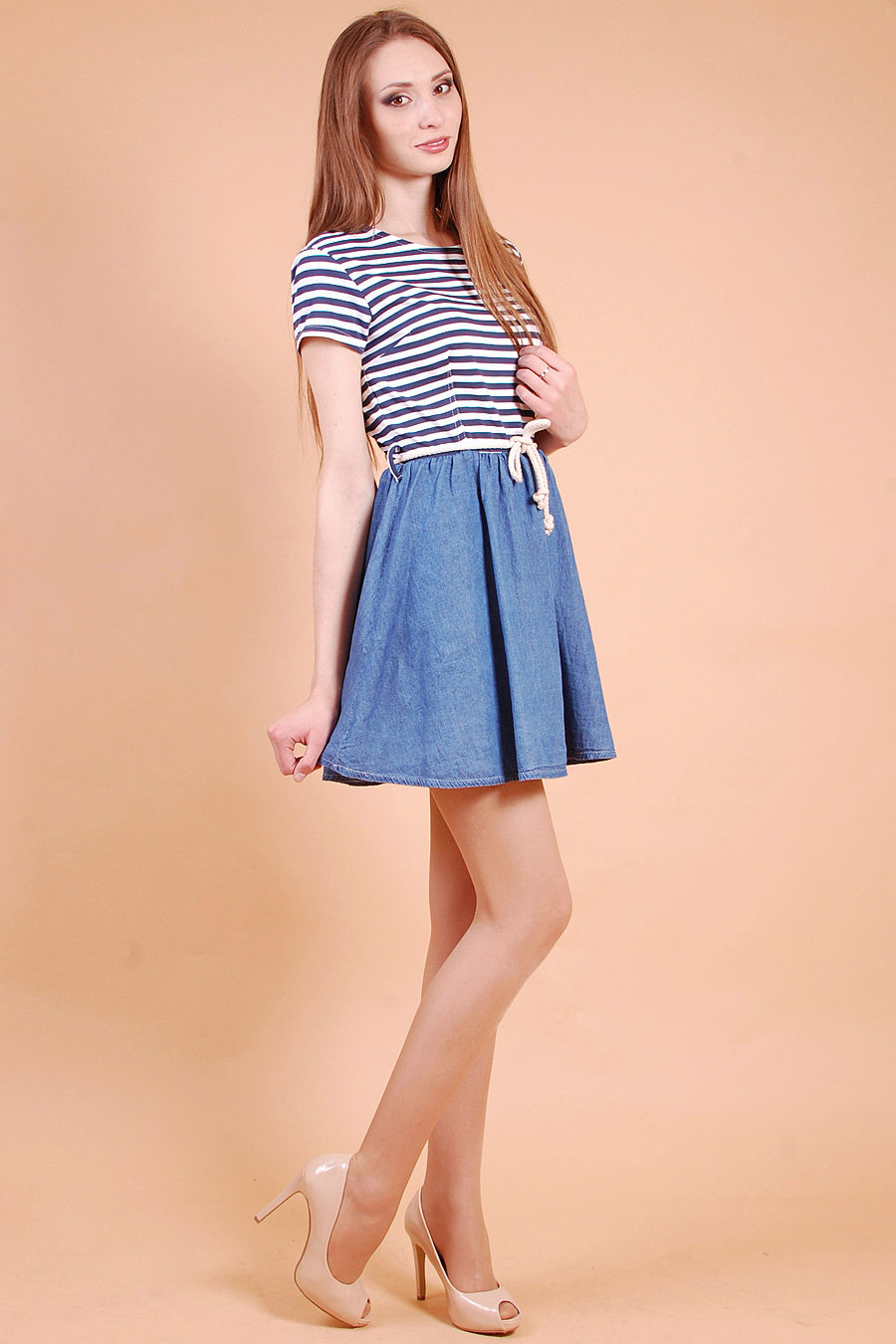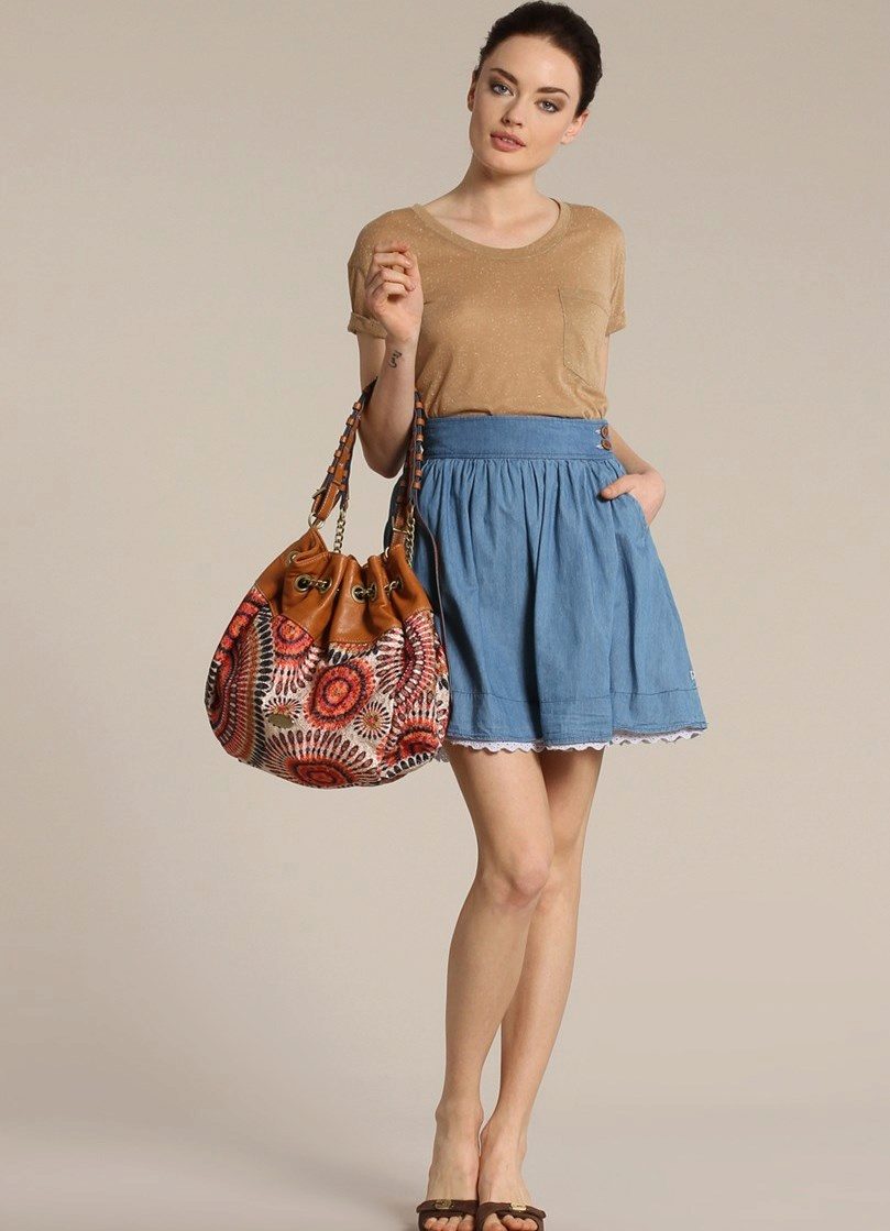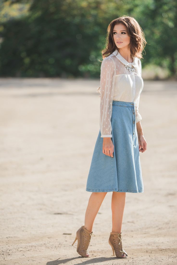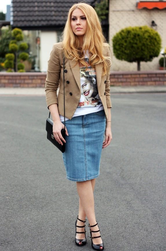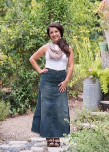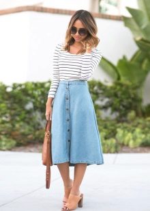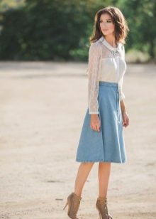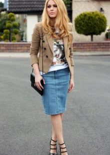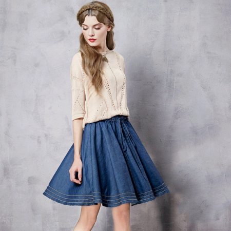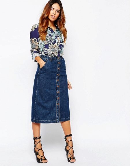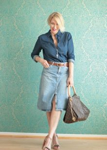 Denim skirt goes well with many things from the "adult" wardrobe, making it a pleasant variety. Shirts, blouses, jackets, cardigans will make a harmonious ensemble with a denim skirt. Choosing shoes will not be a problem either: classic shoes, boots with heels, ankle boots or elegant sandals.