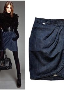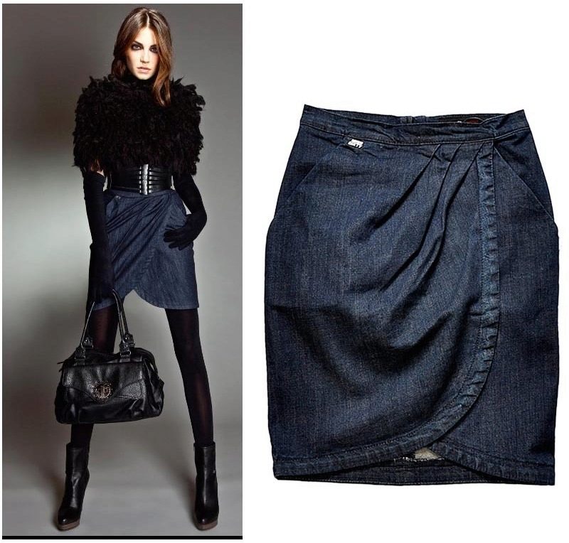 Denim tulips look more informal than the same models from other materials.But on the other hand, they are perfectly combined with clothes in a variety of styles, including sports. One of the most interesting options for a tulip skirt is a model with a smell.