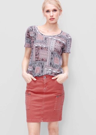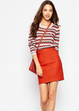 In this trendy season, it is recommended to give preference to deep, dark shades of red - wine, burgundy, chestnut, copper - they look very elegant and noble. A red denim skirt will go well with the top of white, black or blue.