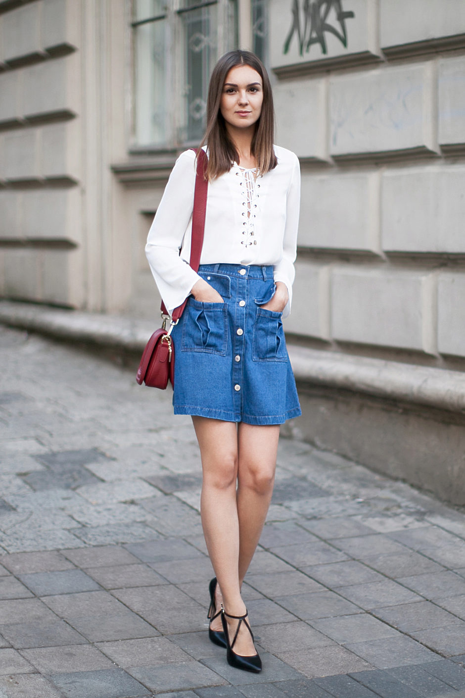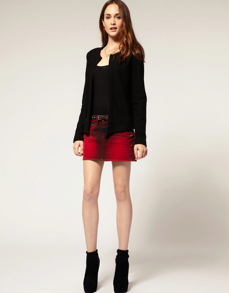 Red denim skirts are rarely found in clothing stores, so if you wanted to get such a thing, it would be easiest to sew it yourself or order it in the studio.