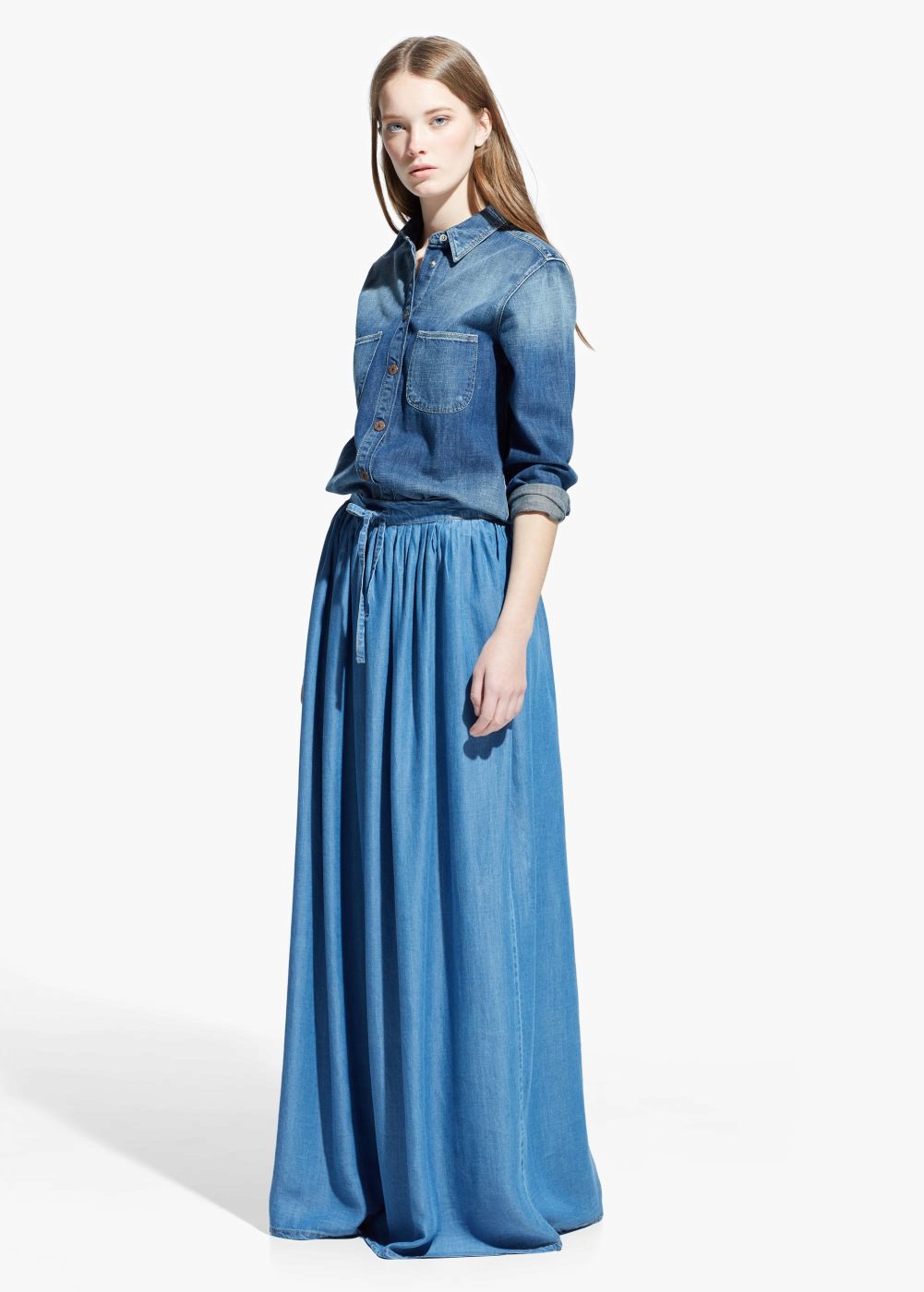 For a while, maxi skirts made of thick jeans with a clearly defined silhouette, for example, gode, were distributed. Today, free models of thin fabric are more relevant, so we advise you to pay attention to spacious denim skirts in the style of country or boho.
