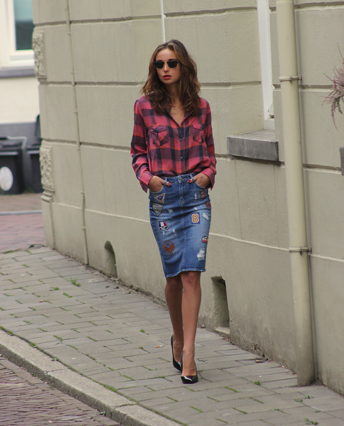 Pencil skirt with torn edges and scuffs makes up an unexpectedly harmonious combination with a bright checkered shirt, large sunglasses, black boats and a tonal bag.